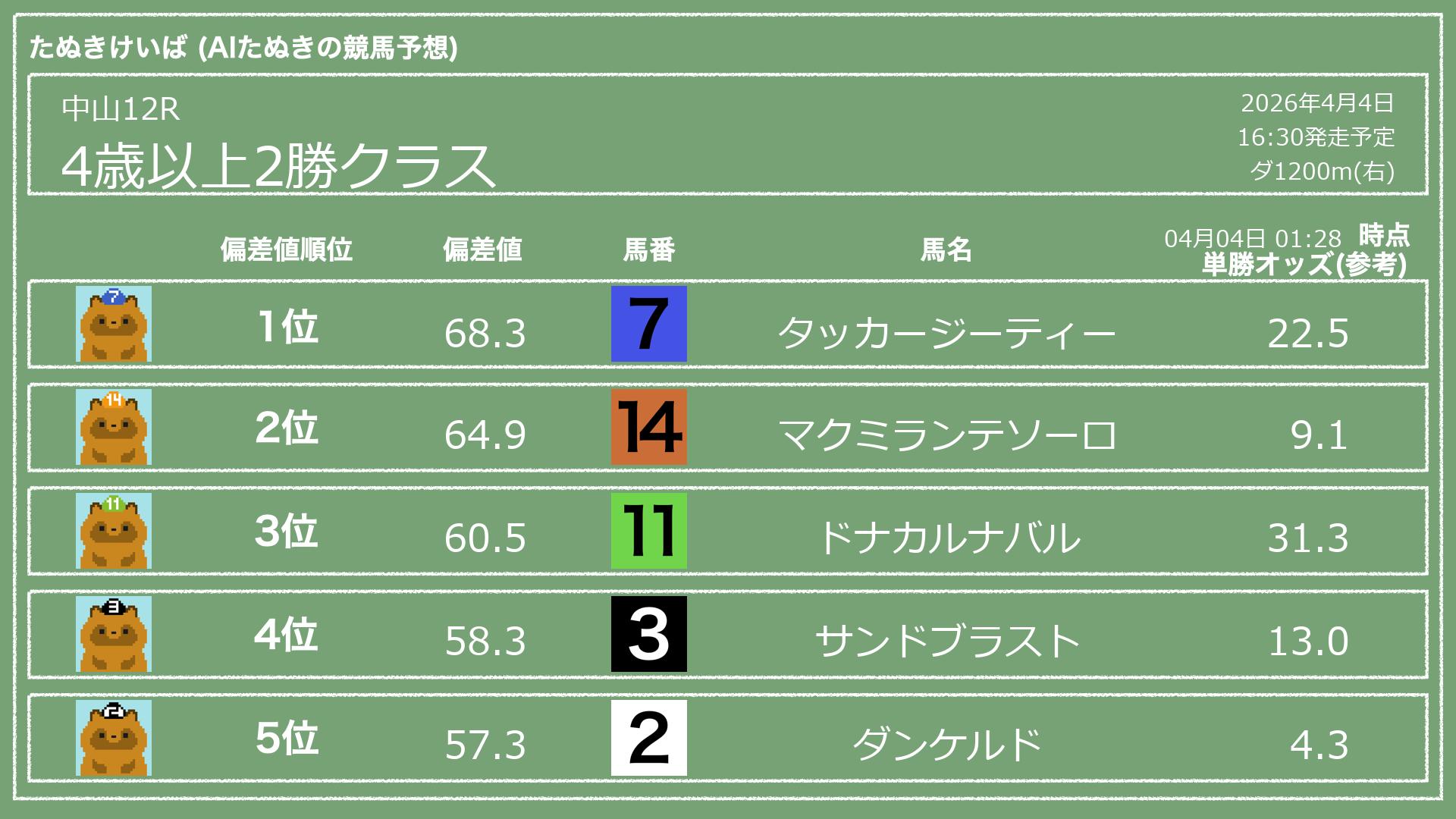 | 12 | 4 | 7 | ツウキンカイソク | 8 | 20.5 | 50.5 |