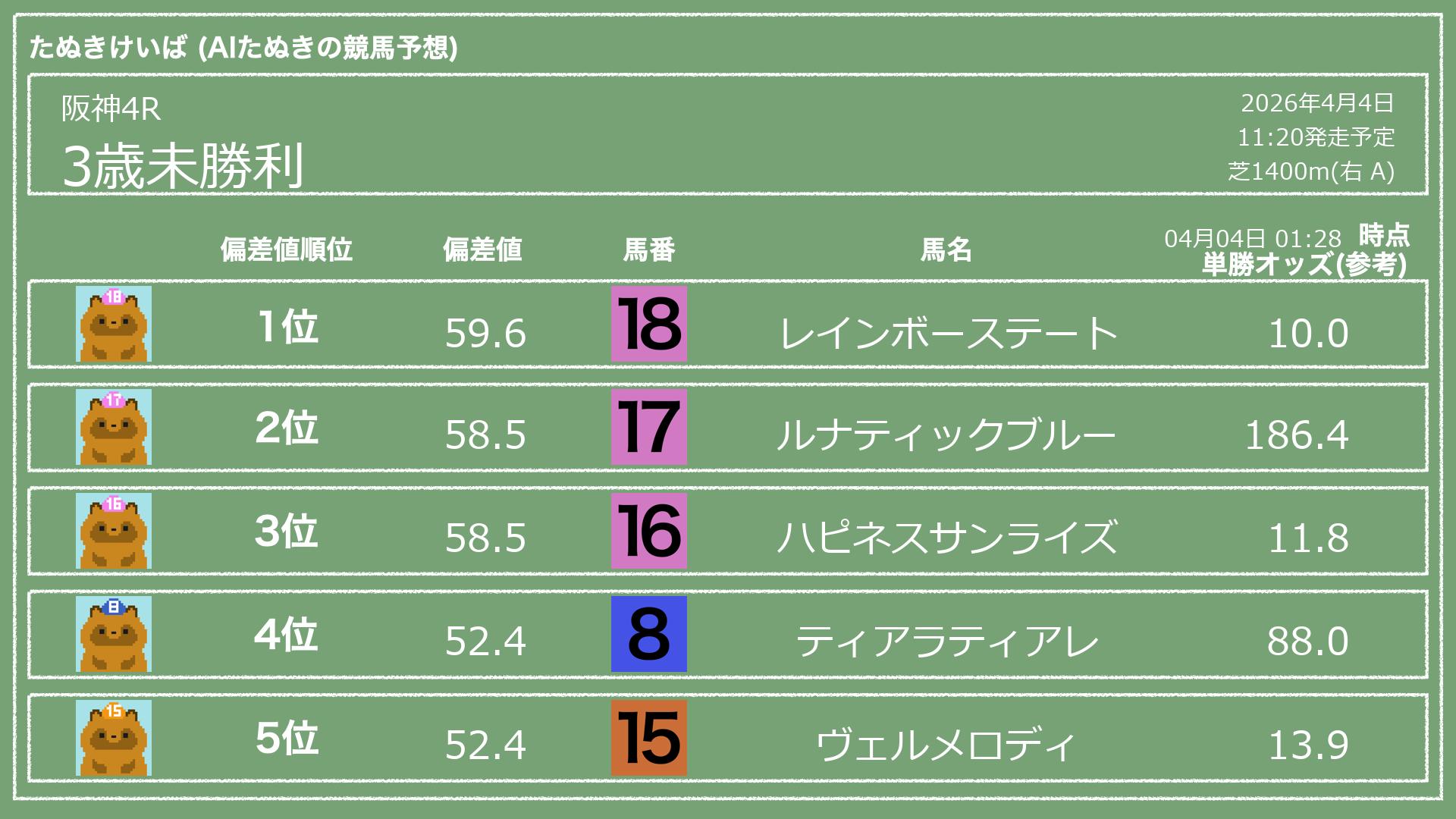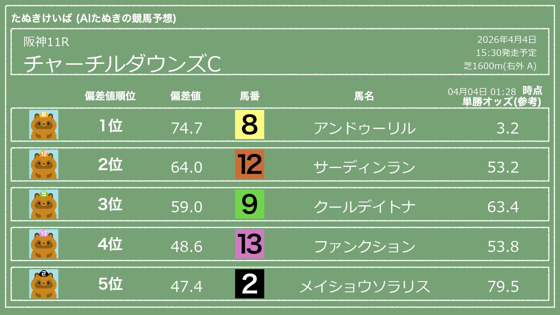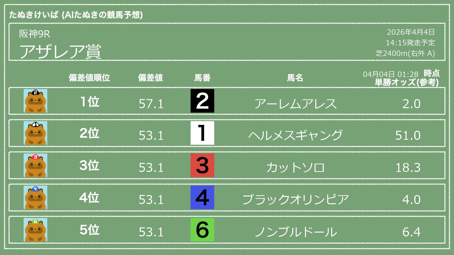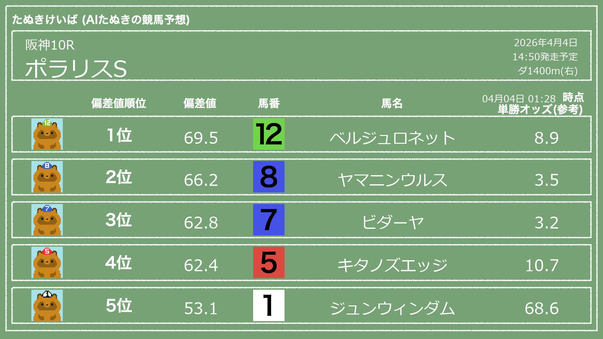 「たぬきけいば」による無料競馬予想です🥳
