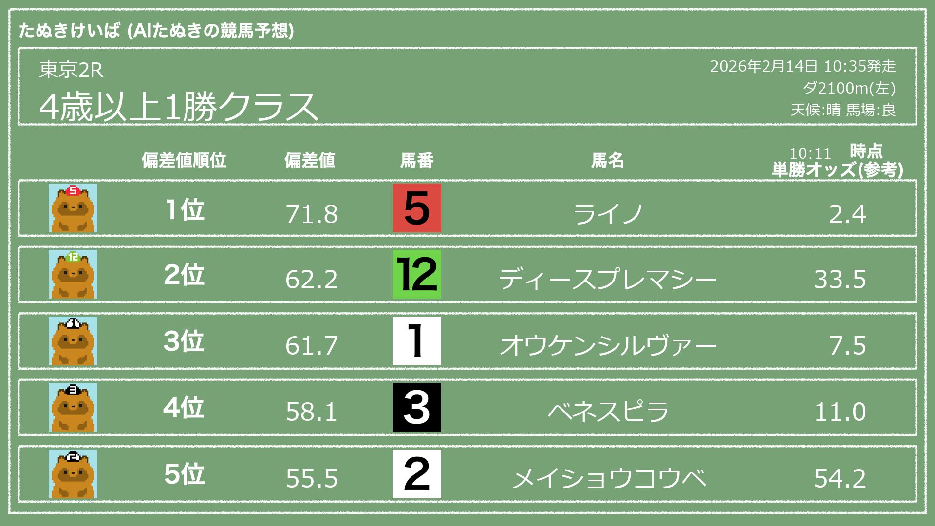 うちのたぬき(AI)による競馬予想です。レースごとに各馬の能力を偏差値で表現してみました。