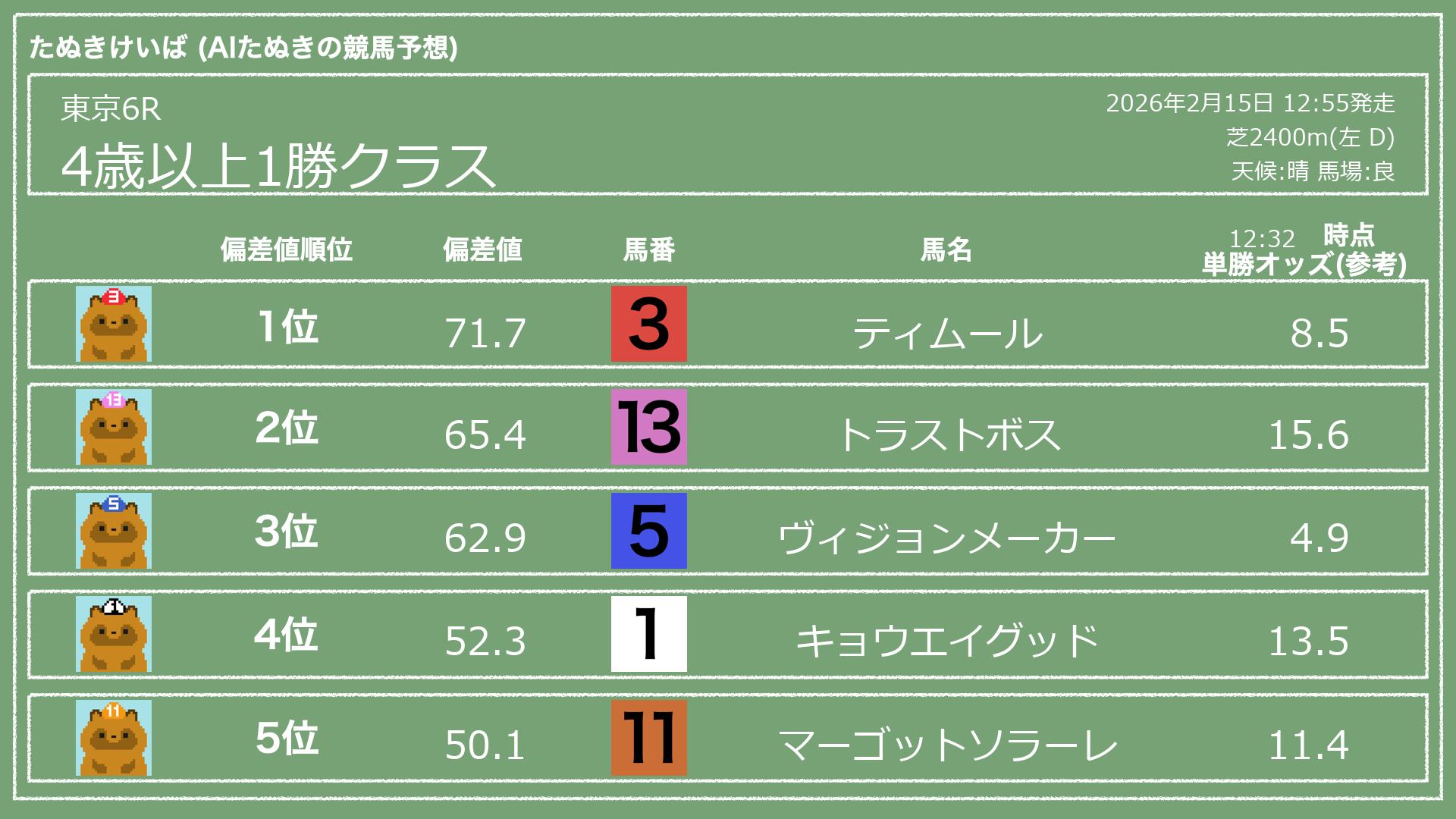 2026.02.15 東京6Rの予想