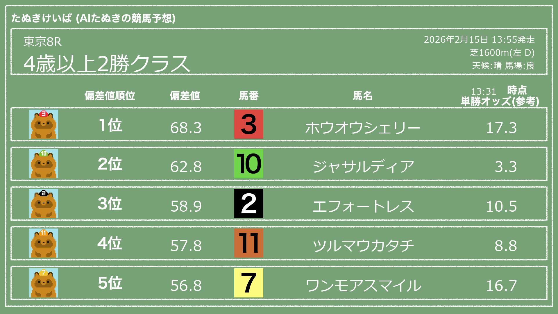 うちのたぬき(AI)による競馬予想です。レースごとに各馬の能力を偏差値で表現してみました。