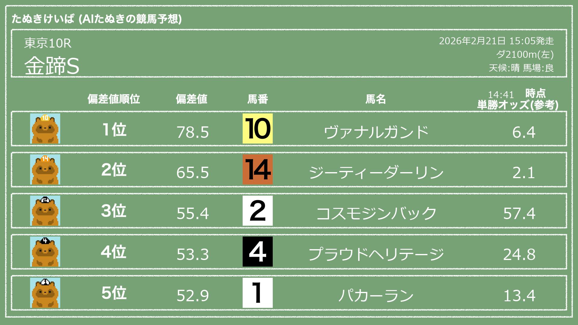 うちのたぬき(AI)による競馬予想です。レースごとに各馬の能力を偏差値で表現してみました。