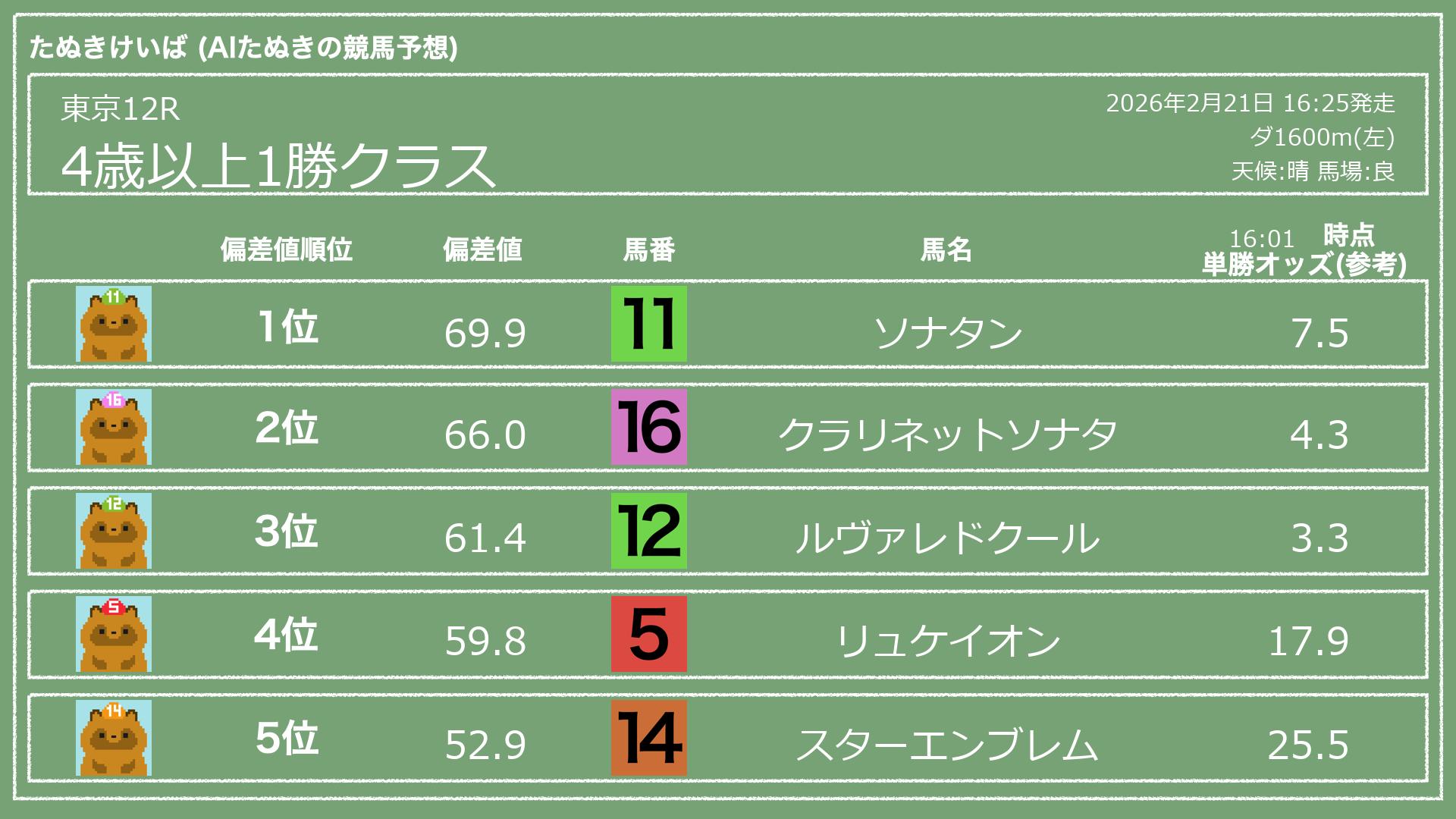うちのたぬき(AI)による競馬予想です。