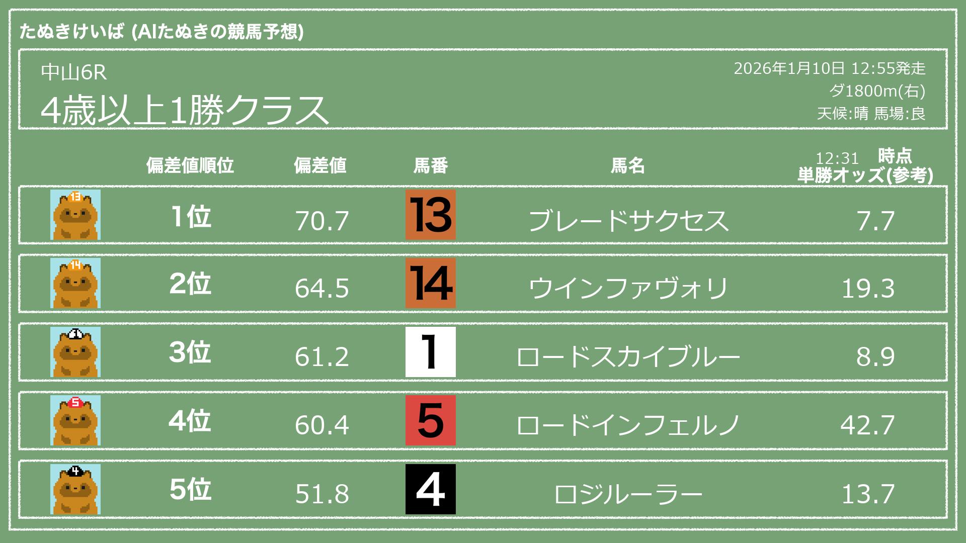 うちのたぬき(AI)による競馬予想です。レースごとに各馬の能力を偏差値で表現してみました。