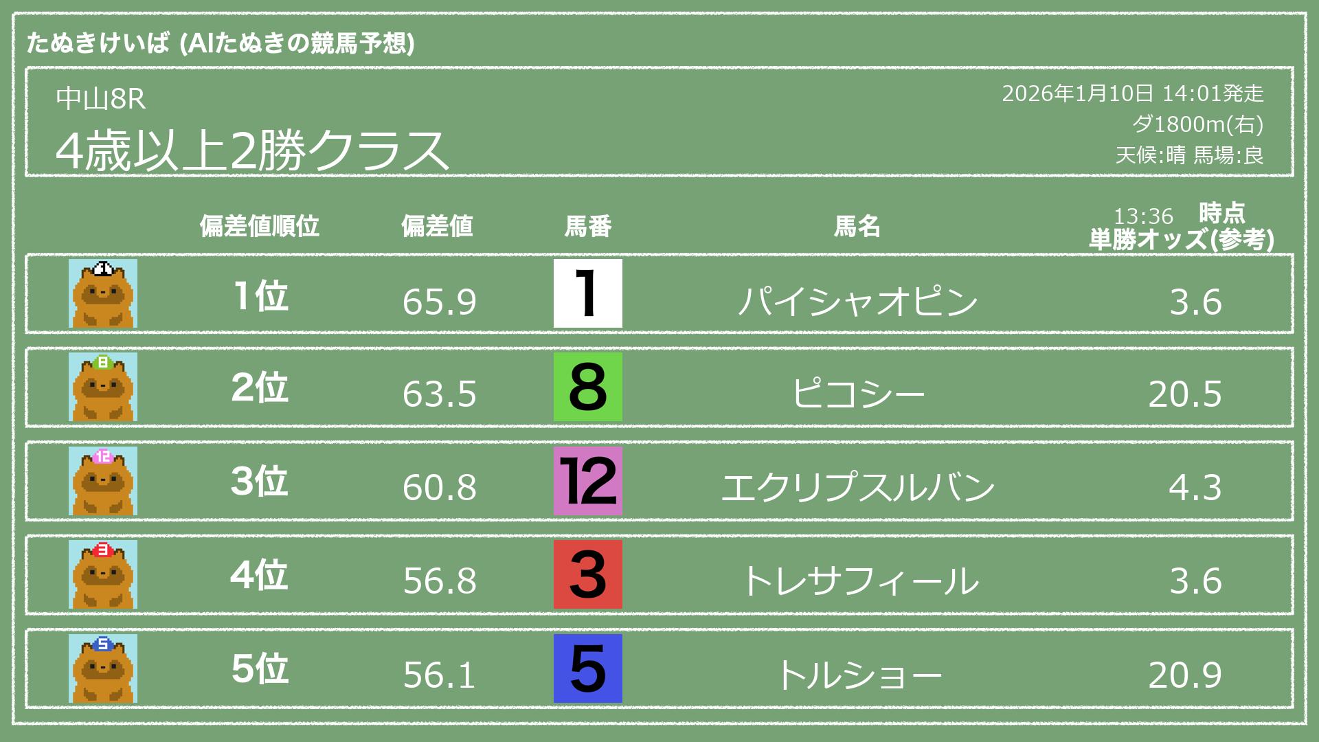 うちのたぬき(AI)による競馬予想です。レースごとに各馬の能力を偏差値で表現してみました。
