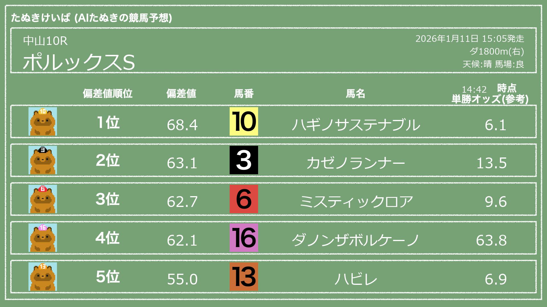 うちのたぬき(AI)による競馬予想です。レースごとに各馬の能力を偏差値で表現してみました。