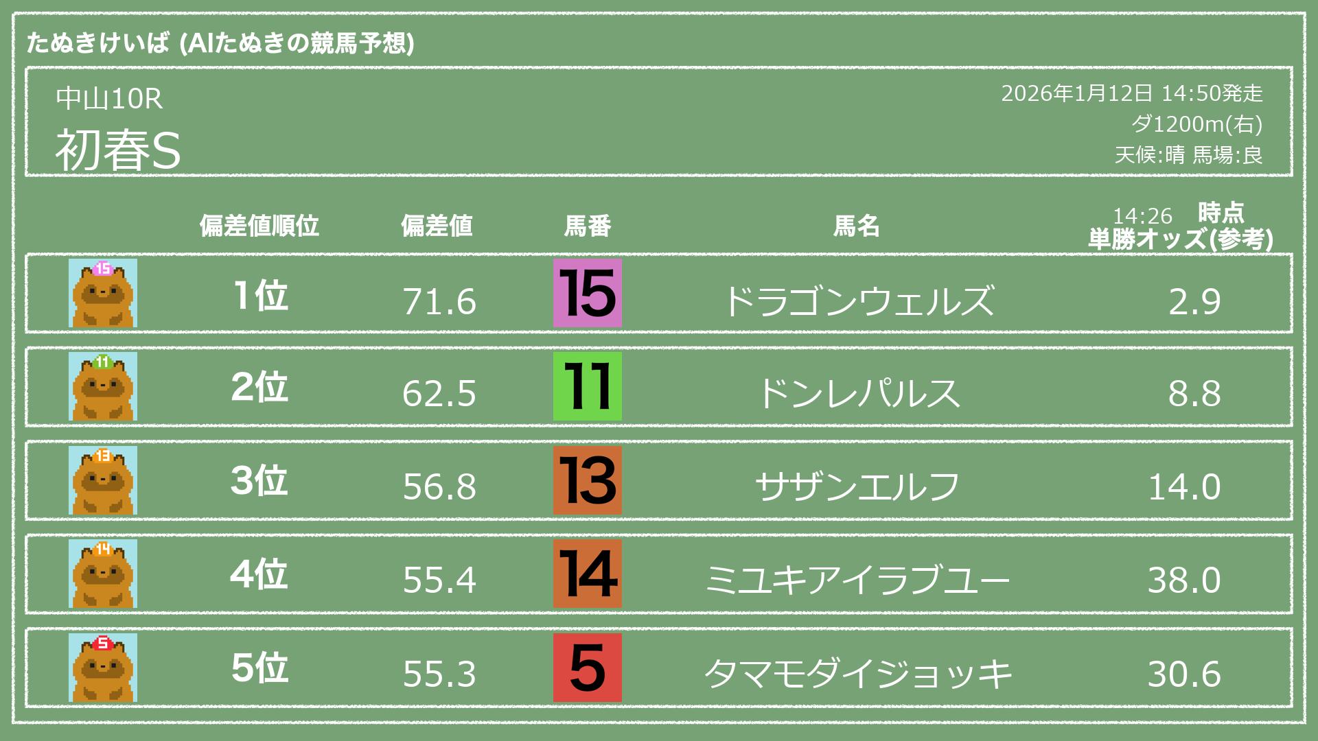 うちのたぬき(AI)による競馬予想です。レースごとに各馬の能力を偏差値で表現してみました。