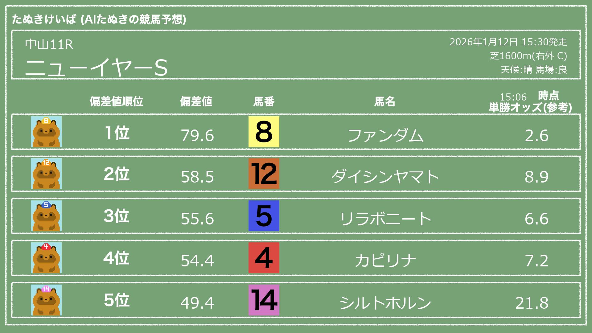 うちのたぬき(AI)による競馬予想です。