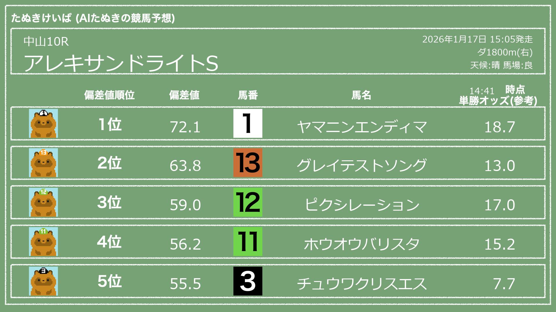 うちのたぬき(AI)による競馬予想です。レースごとに各馬の能力を偏差値で表現してみました。