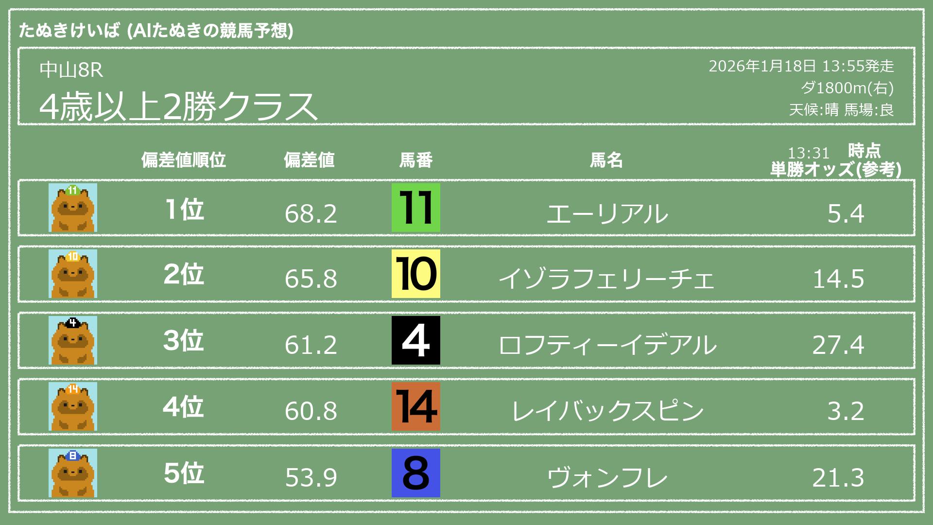 うちのたぬき(AI)による競馬予想です。