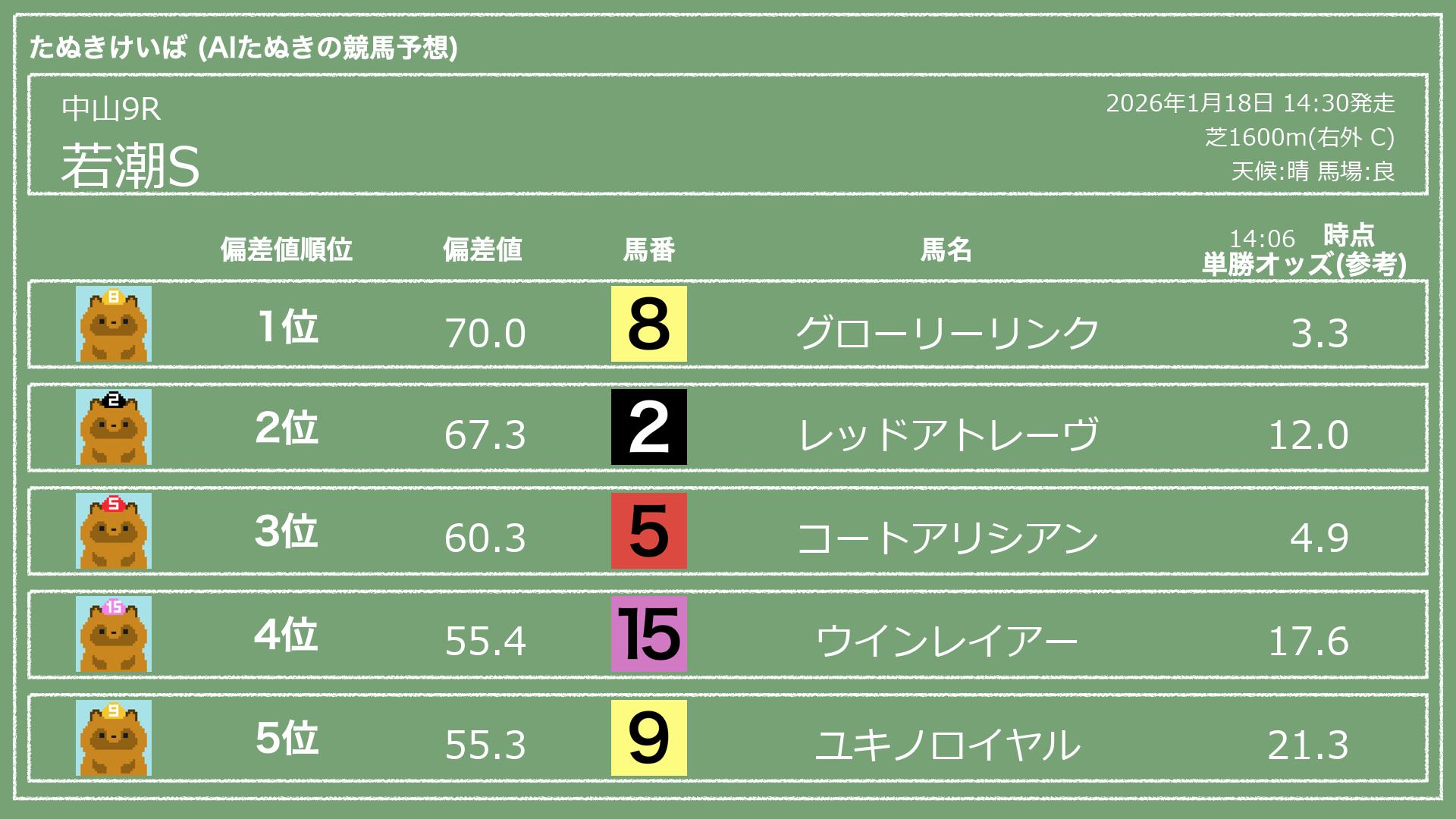 うちのたぬき(AI)による競馬予想です。レースごとに各馬の能力を偏差値で表現してみました。