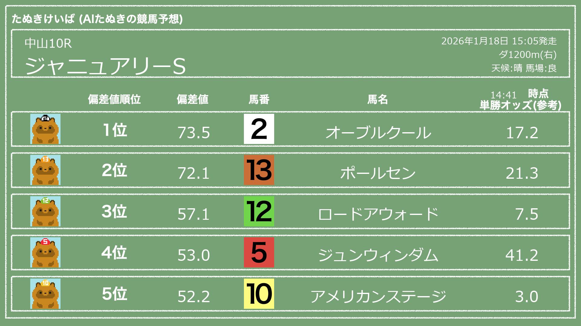 うちのたぬき(AI)による競馬予想です。レースごとに各馬の能力を偏差値で表現してみました。