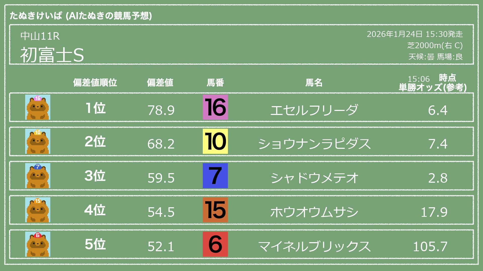 うちのたぬき(AI)による競馬予想です。レースごとに各馬の能力を偏差値で表現してみました。