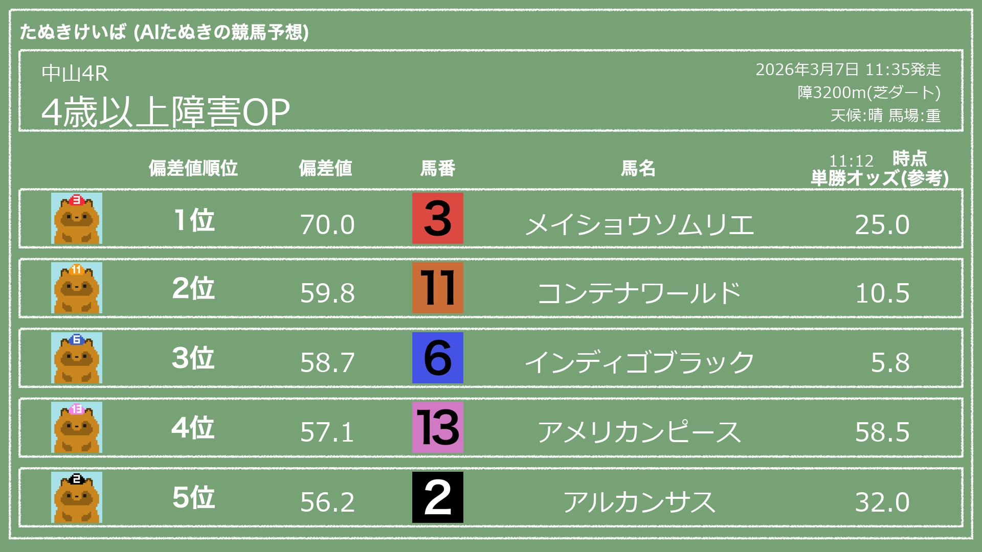 うちのたぬき(AI)による競馬予想です。