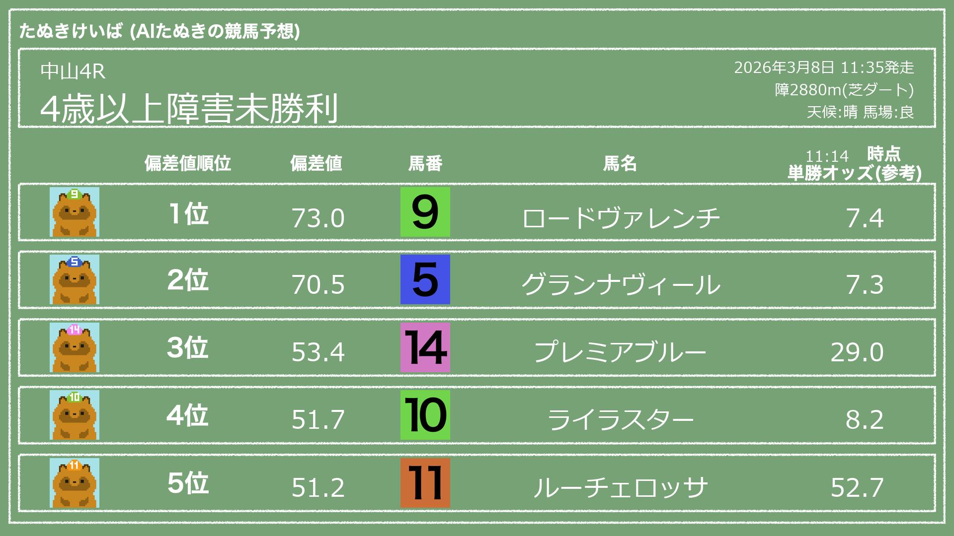 うちのたぬき(AI)による競馬予想です。