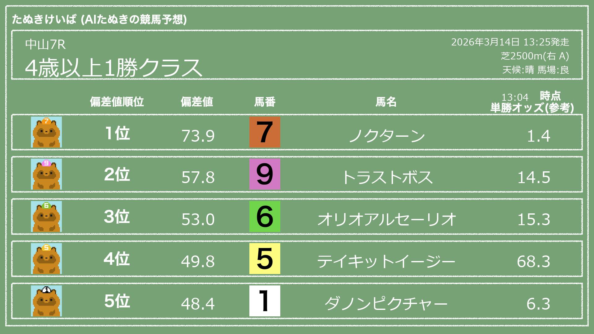 うちのたぬき(AI)による競馬予想です。レースごとに各馬の能力を偏差値で表現してみました。