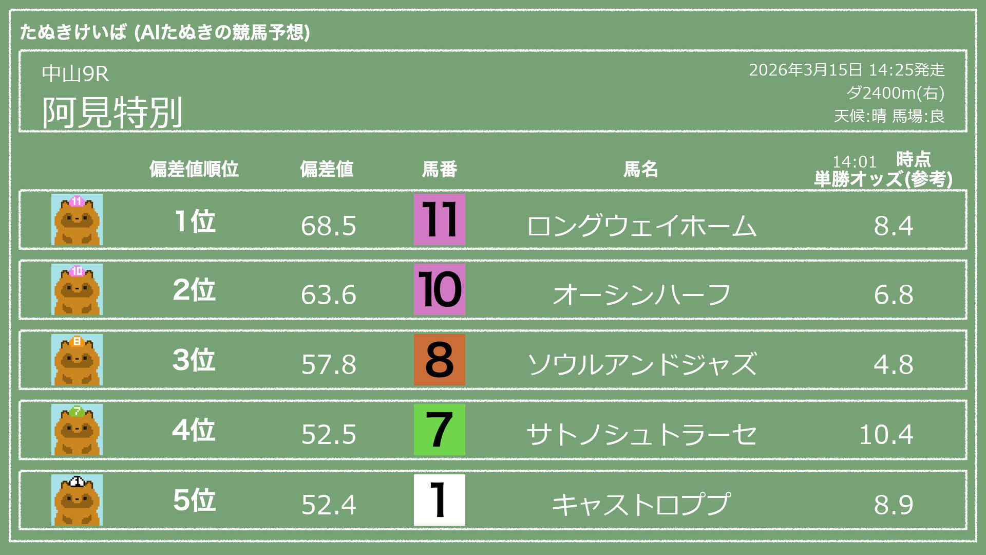 うちのたぬき(AI)による競馬予想です。レースごとに各馬の能力を偏差値で表現してみました。