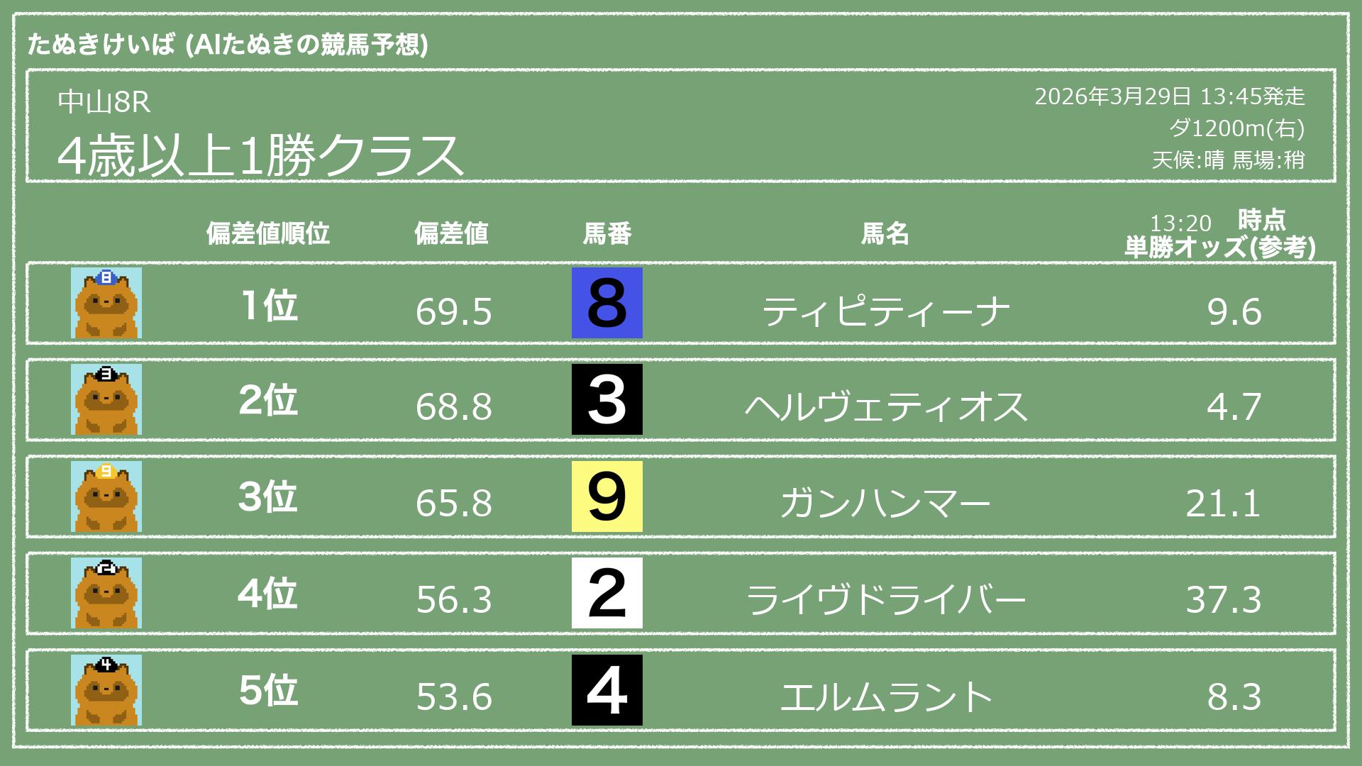 うちのたぬき(AI)による競馬予想です。レースごとに各馬の能力を偏差値で表現してみました。