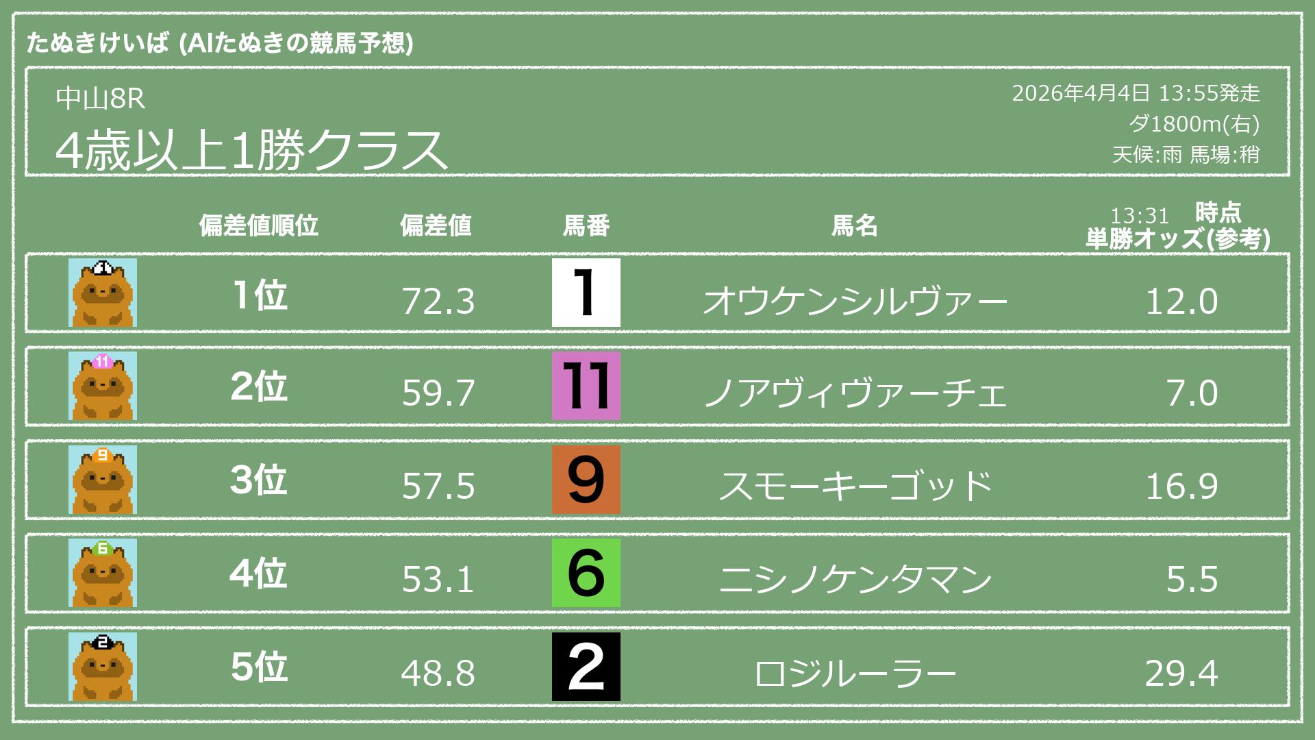 うちのたぬき(AI)による競馬予想です。レースごとに各馬の能力を偏差値で表現してみました。