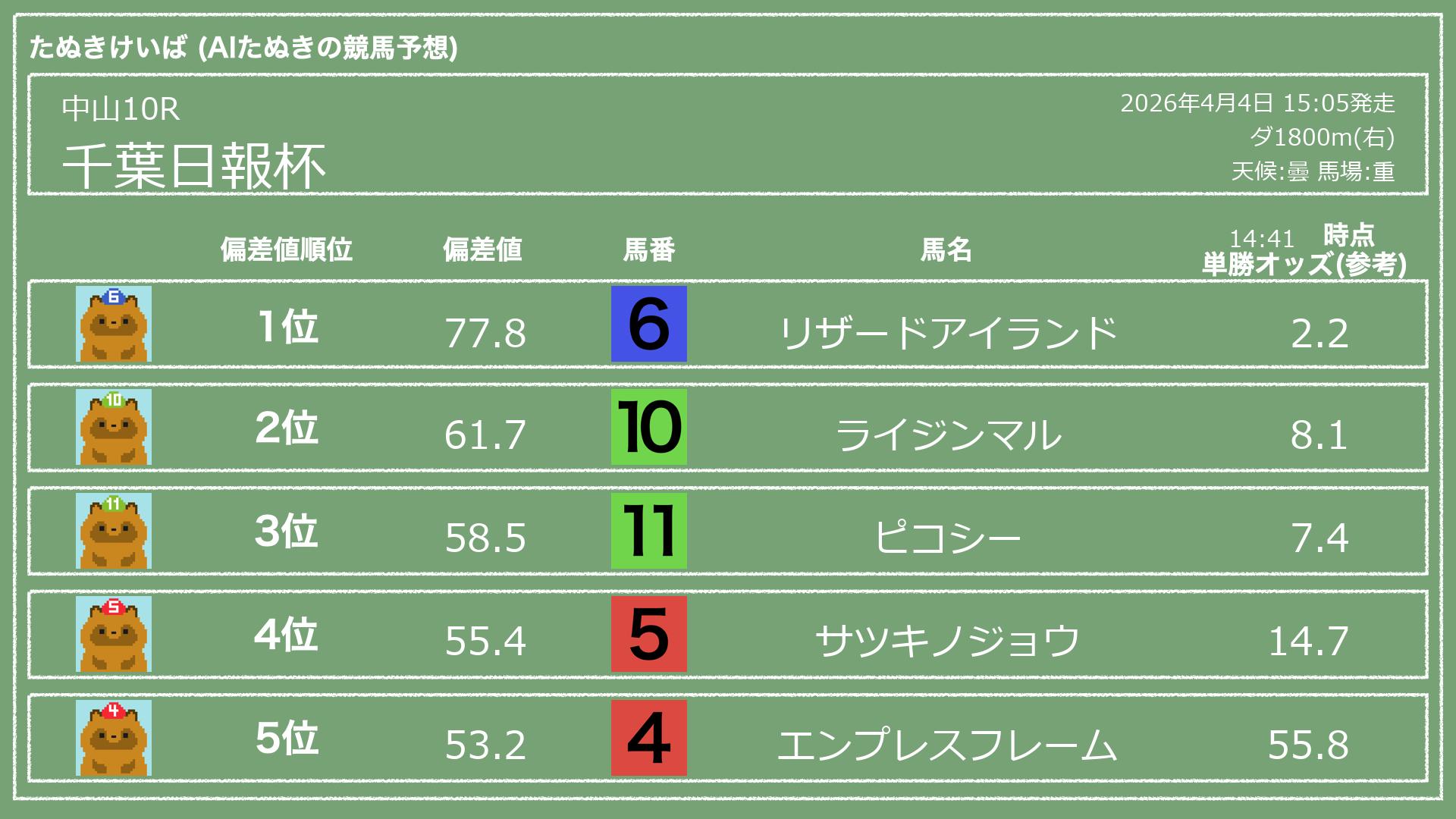 うちのたぬき(AI)による競馬予想です。レースごとに各馬の能力を偏差値で表現してみました。