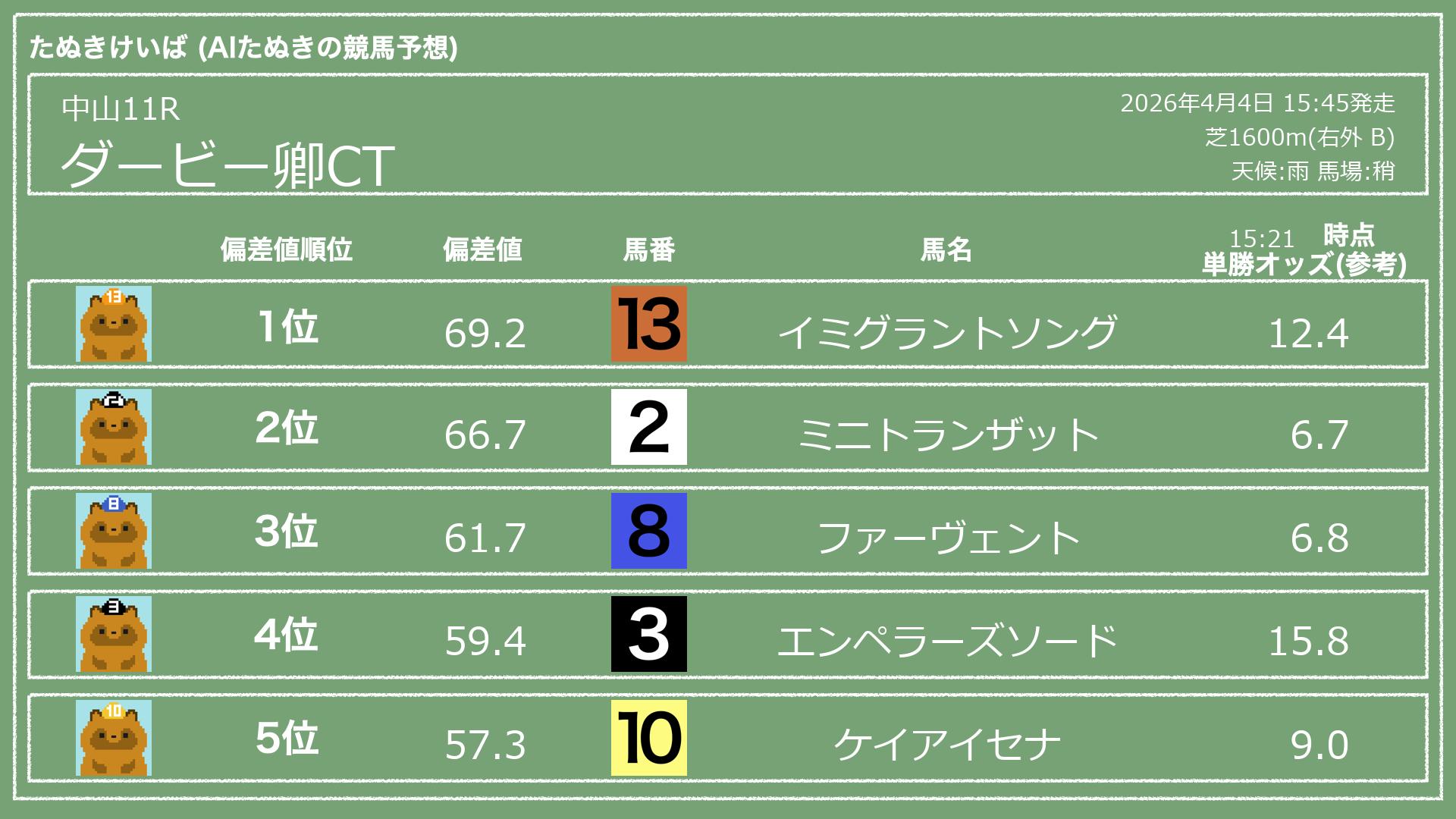 うちのたぬき(AI)による競馬予想です。レースごとに各馬の能力を偏差値で表現してみました。