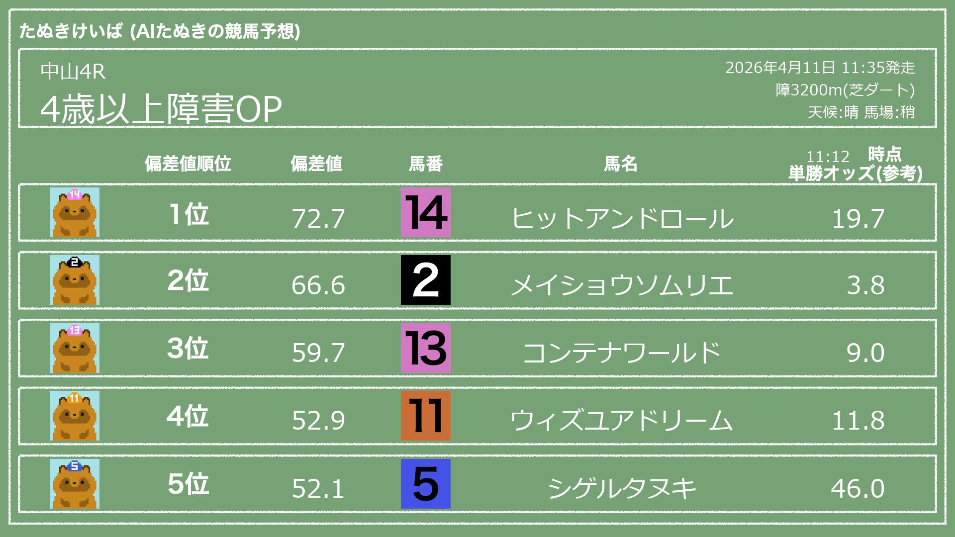 うちのたぬき(AI)による競馬予想です。