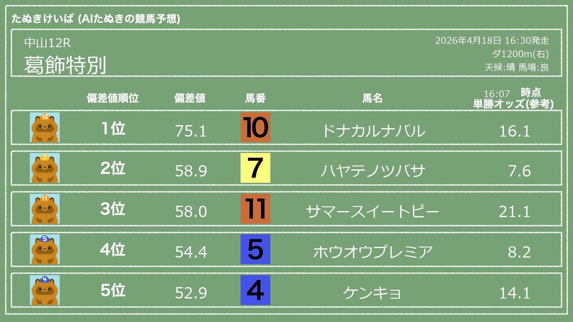 うちのたぬき(AI)による競馬予想です。レースごとに各馬の能力を偏差値で表現してみました。