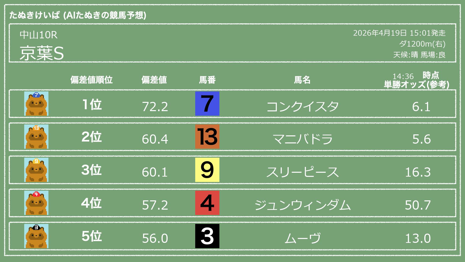 うちのたぬき(AI)による競馬予想です。レースごとに各馬の能力を偏差値で表現してみました。