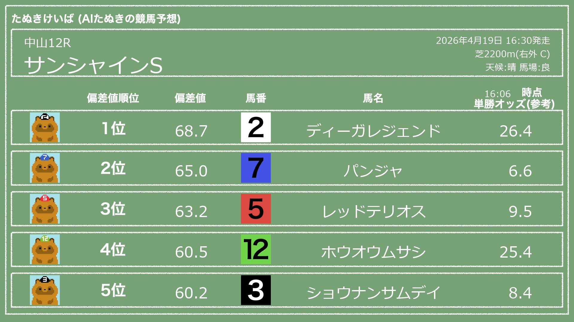 うちのたぬき(AI)による競馬予想です。レースごとに各馬の能力を偏差値で表現してみました。
