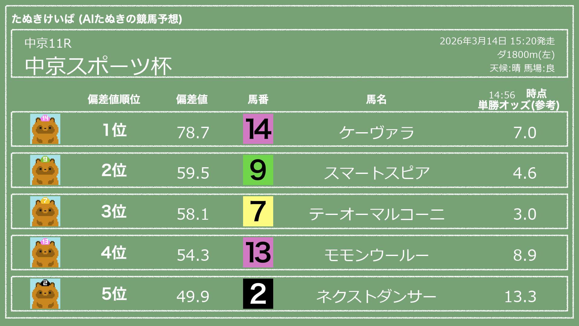 うちのたぬき(AI)による競馬予想です。レースごとに各馬の能力を偏差値で表現してみました。
