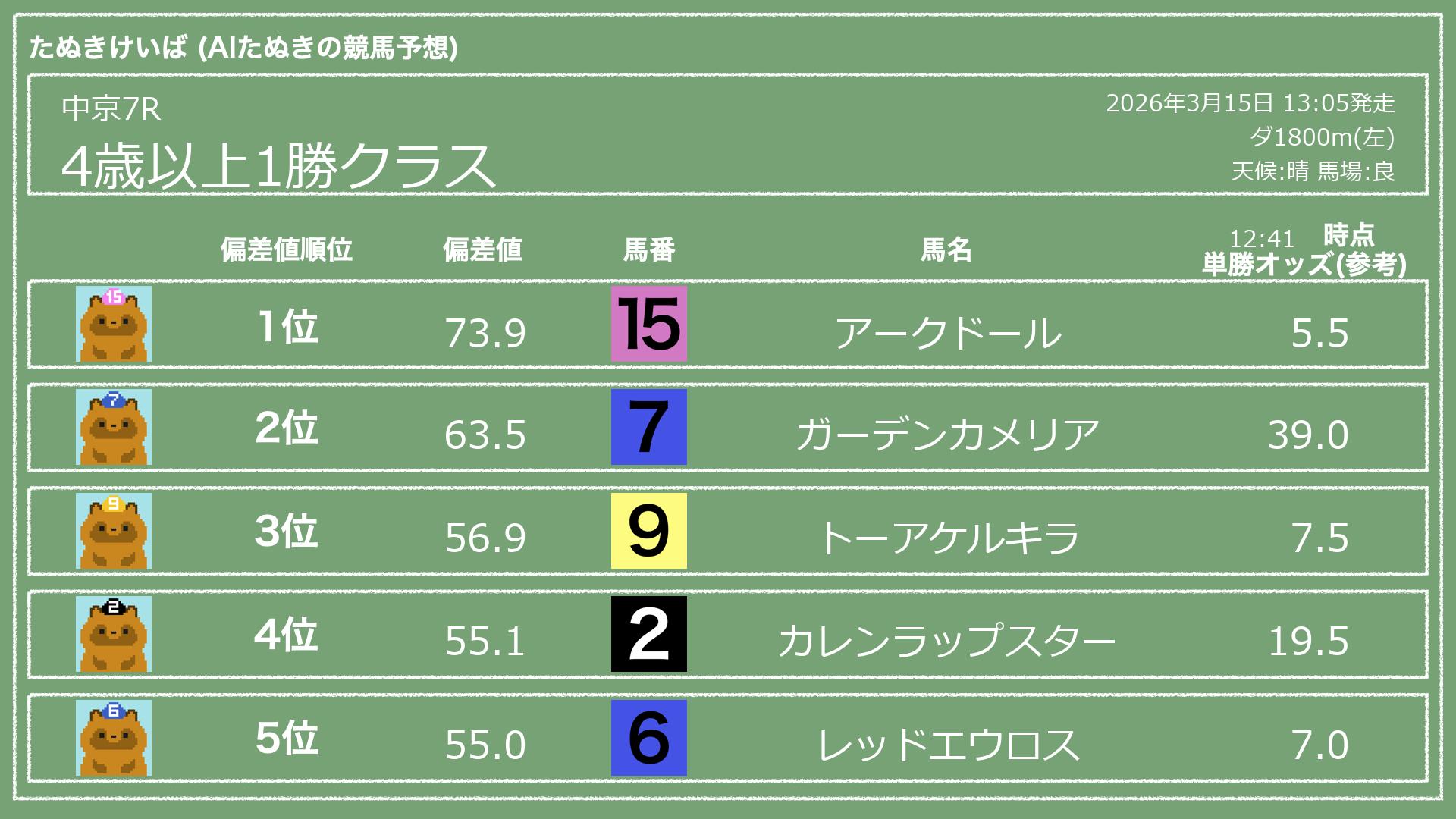 うちのたぬき(AI)による競馬予想です。レースごとに各馬の能力を偏差値で表現してみました。