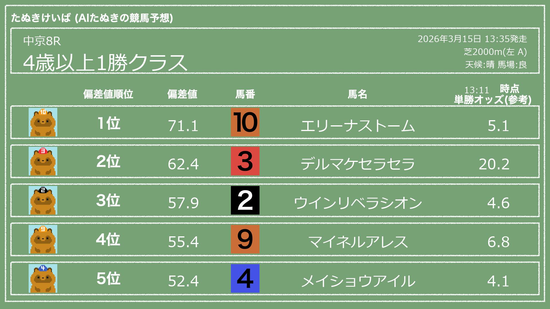 うちのたぬき(AI)による競馬予想です。レースごとに各馬の能力を偏差値で表現してみました。