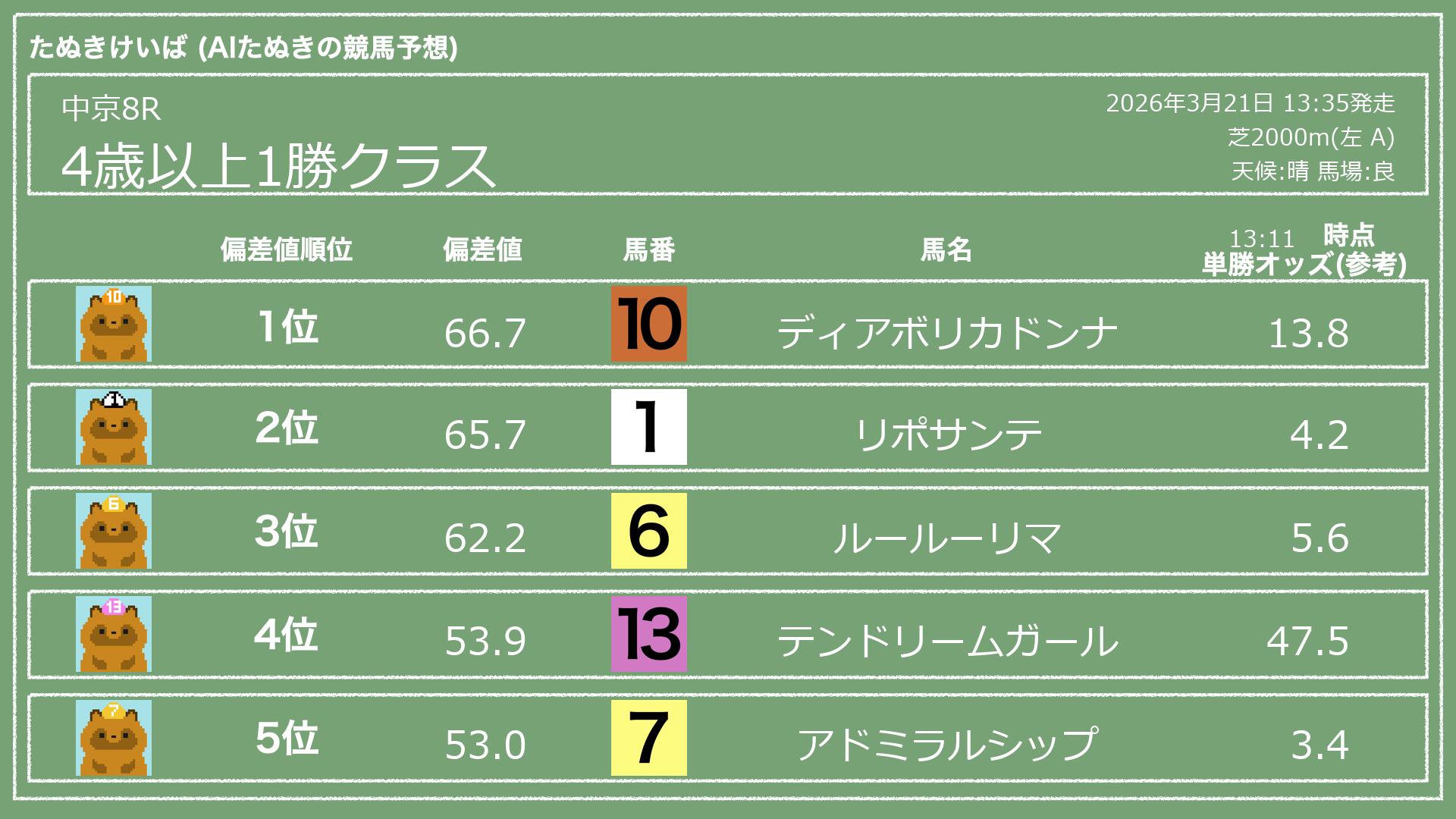 うちのたぬき(AI)による競馬予想です。レースごとに各馬の能力を偏差値で表現してみました。