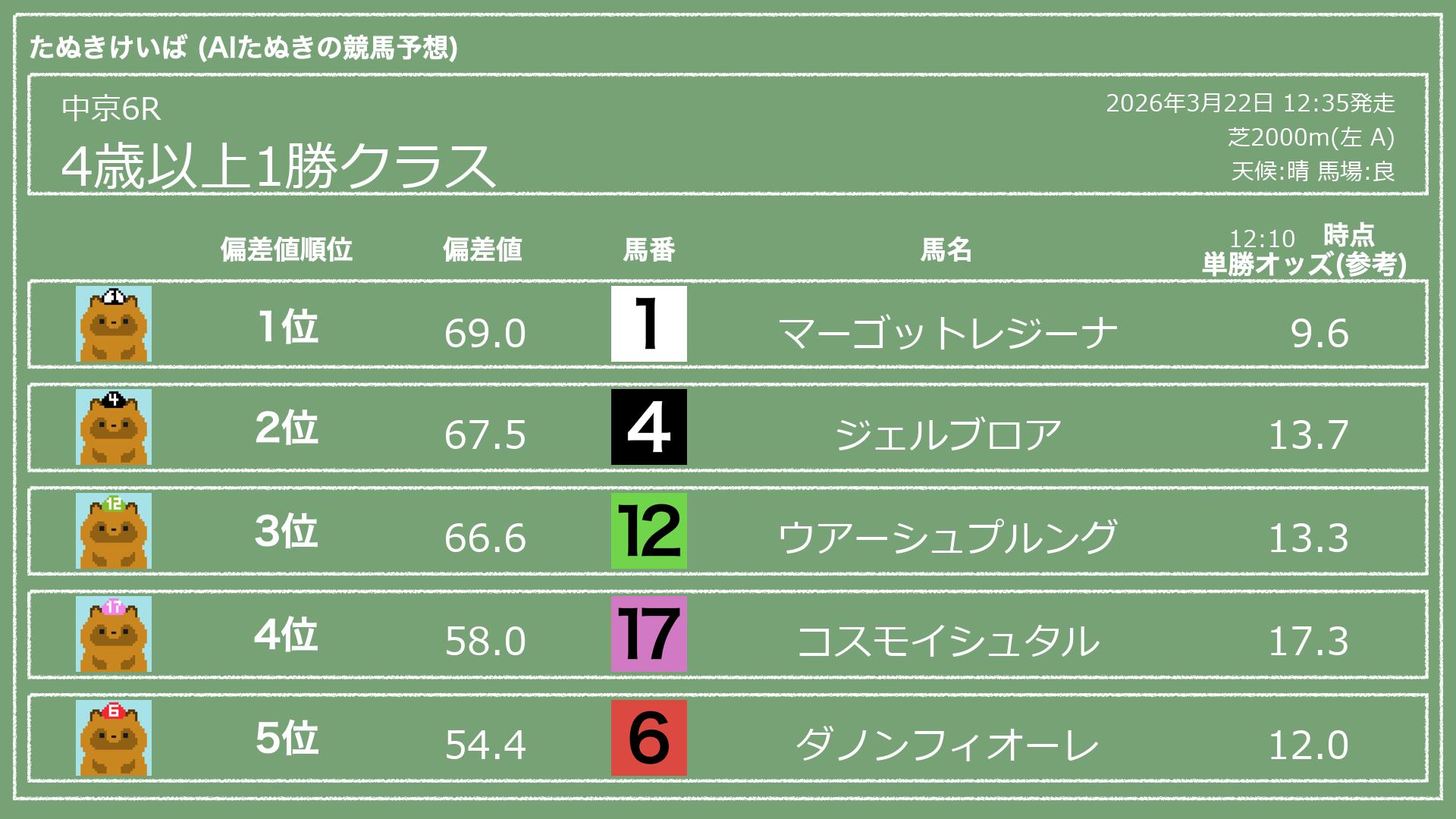 うちのたぬき(AI)による競馬予想です。レースごとに各馬の能力を偏差値で表現してみました。