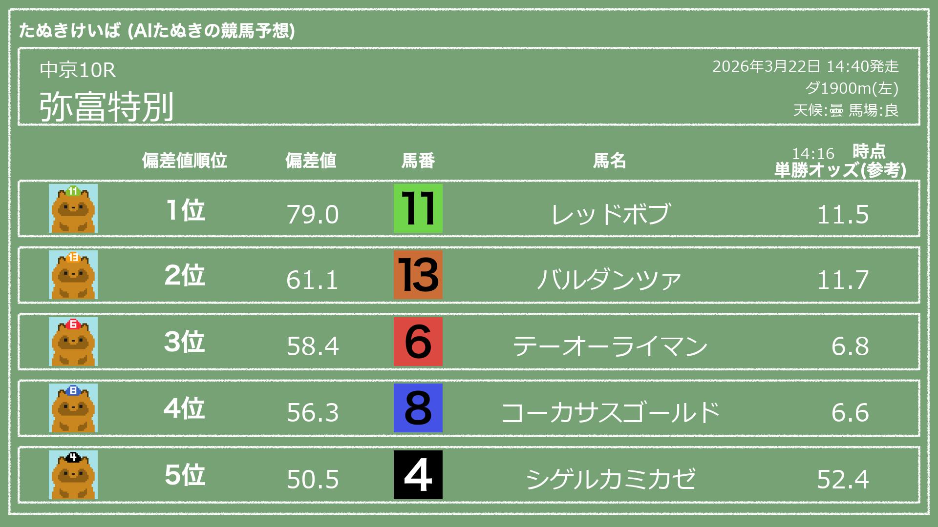 うちのたぬき(AI)による競馬予想です。