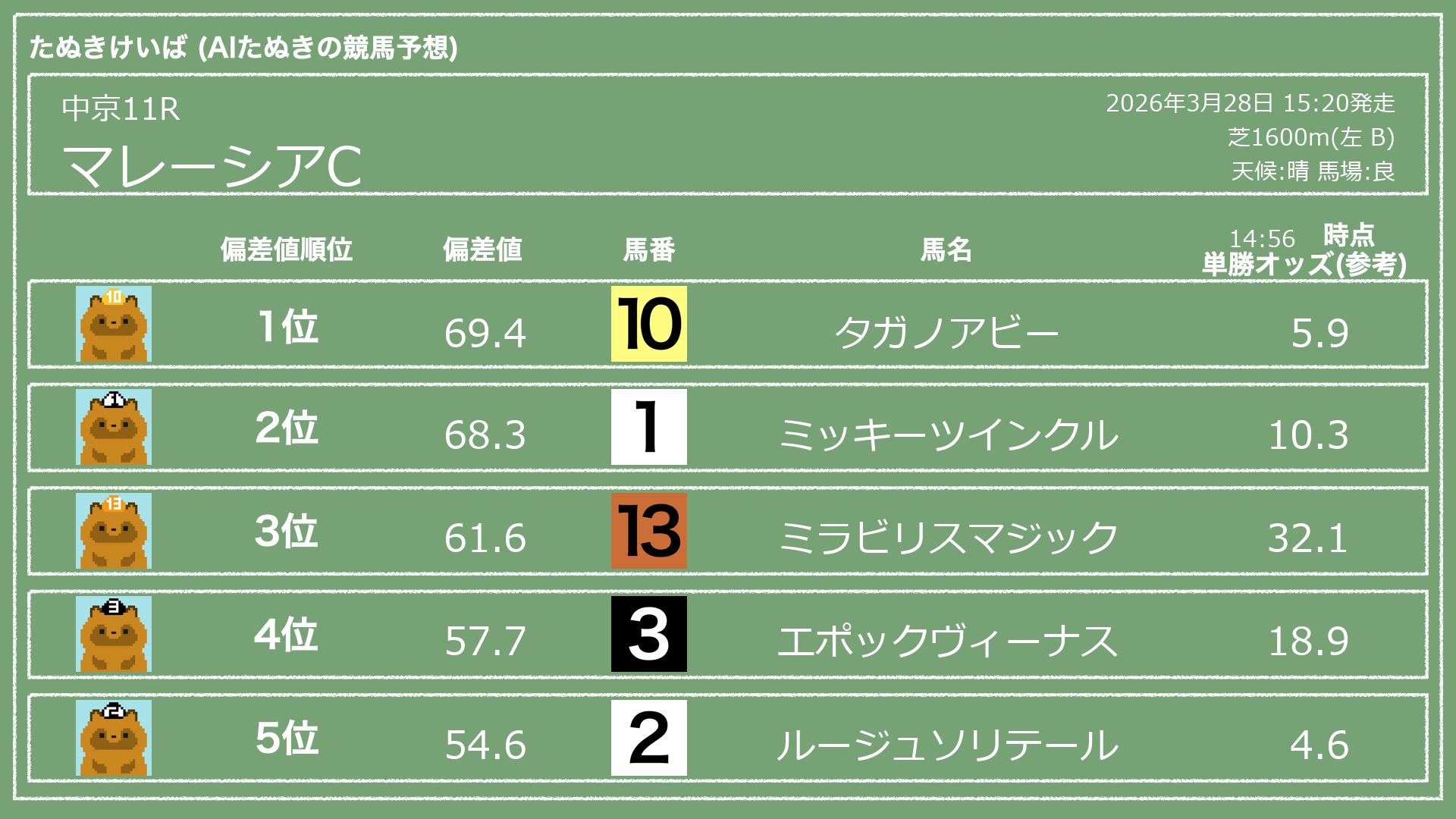 うちのたぬき(AI)による競馬予想です。レースごとに各馬の能力を偏差値で表現してみました。