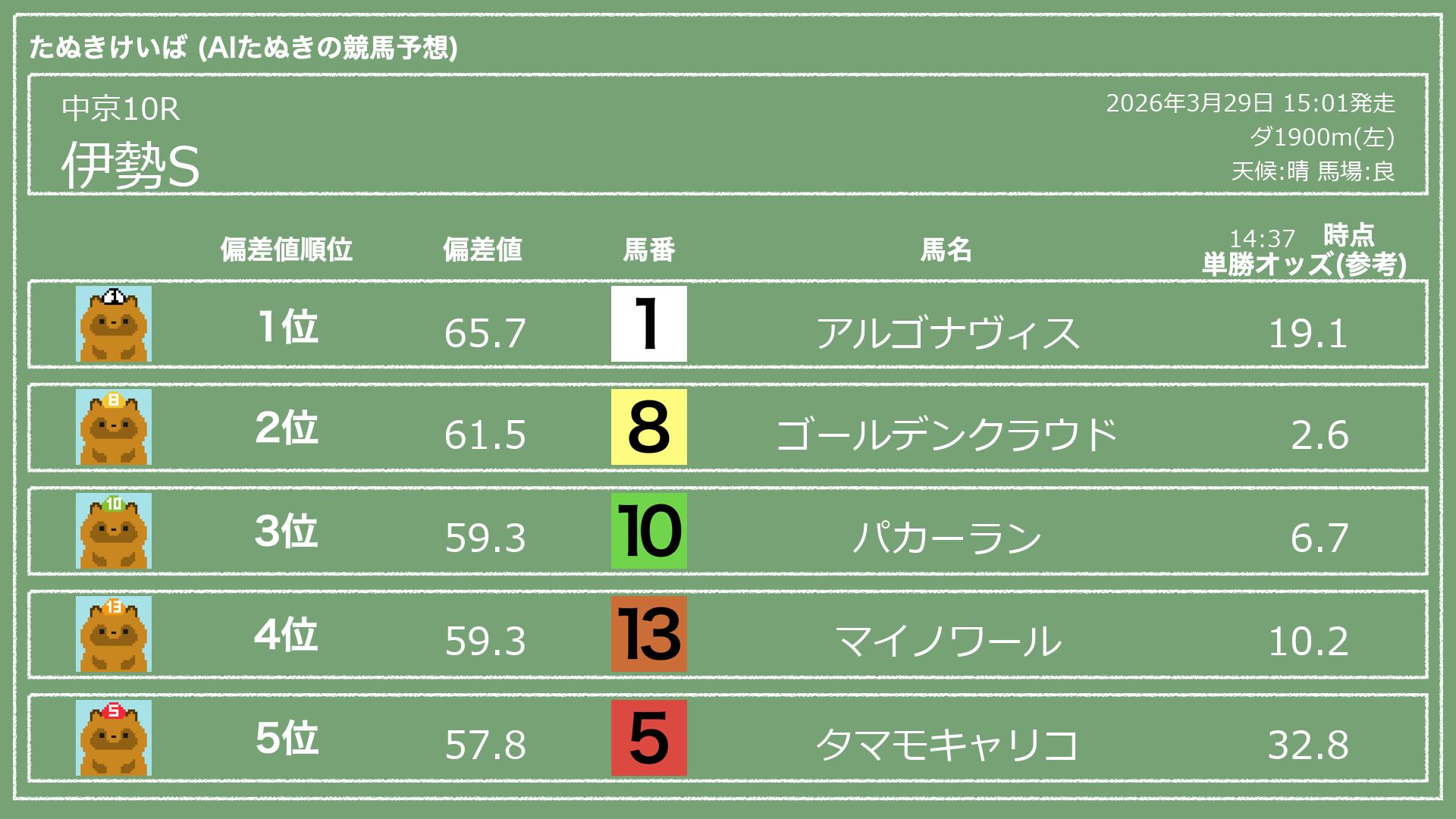 うちのたぬき(AI)による競馬予想です。レースごとに各馬の能力を偏差値で表現してみました。