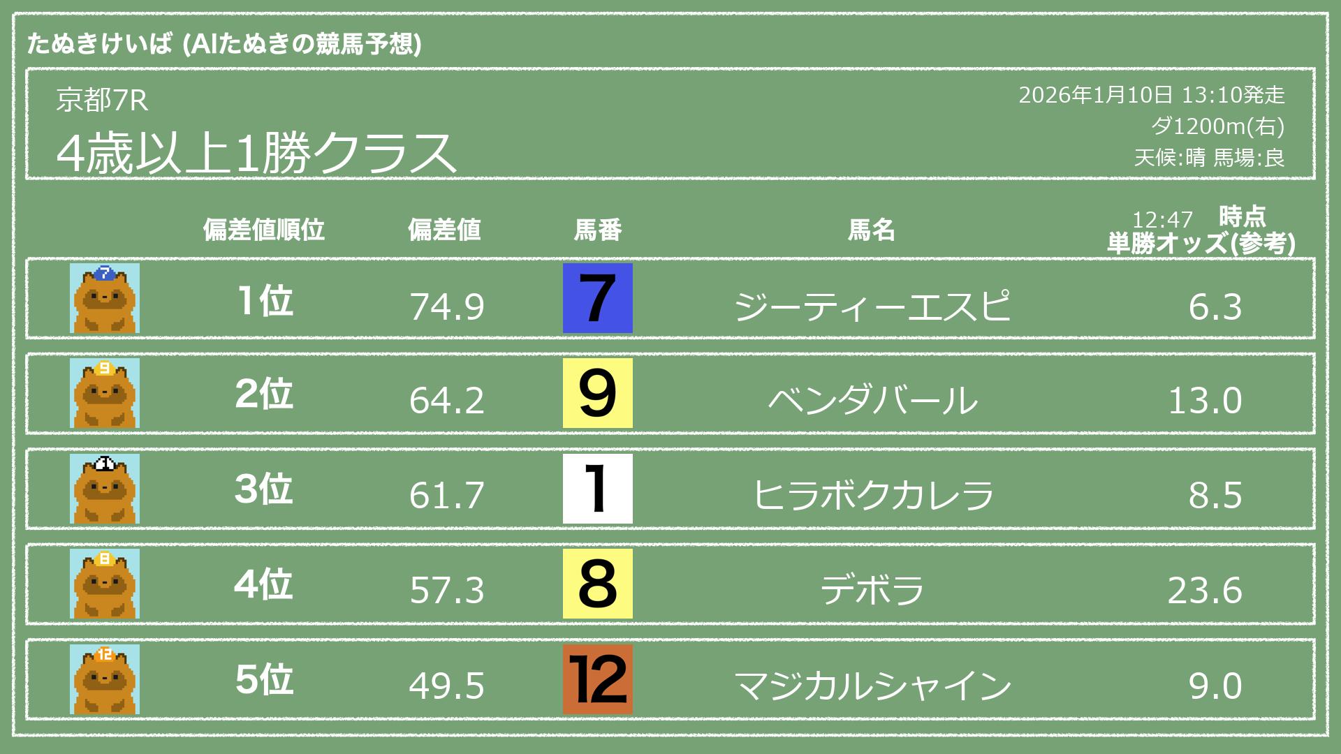 うちのたぬき(AI)による競馬予想です。