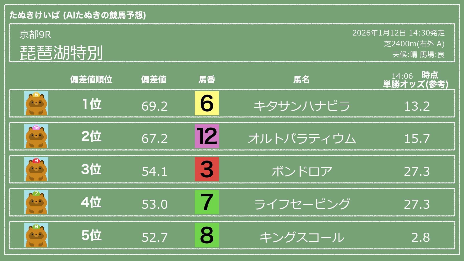 うちのたぬき(AI)による競馬予想です。レースごとに各馬の能力を偏差値で表現してみました。