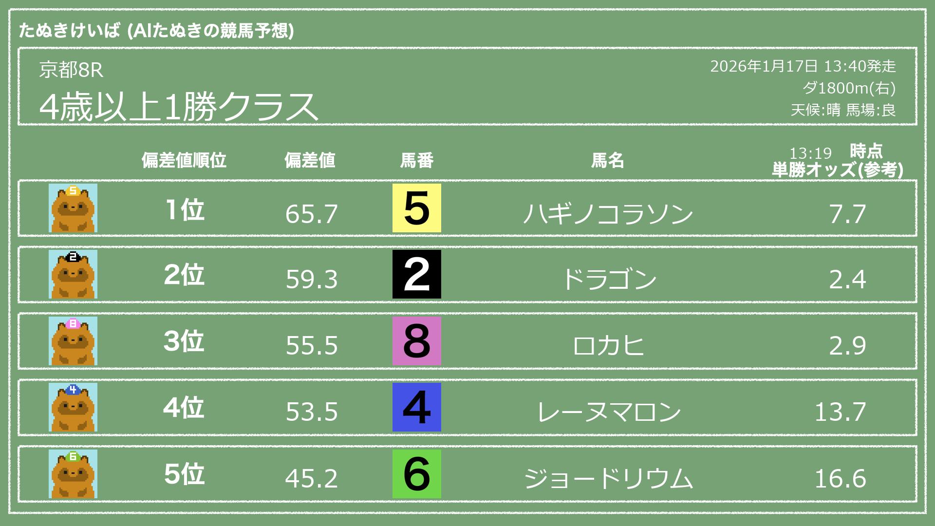 うちのたぬき(AI)による競馬予想です。レースごとに各馬の能力を偏差値で表現してみました。