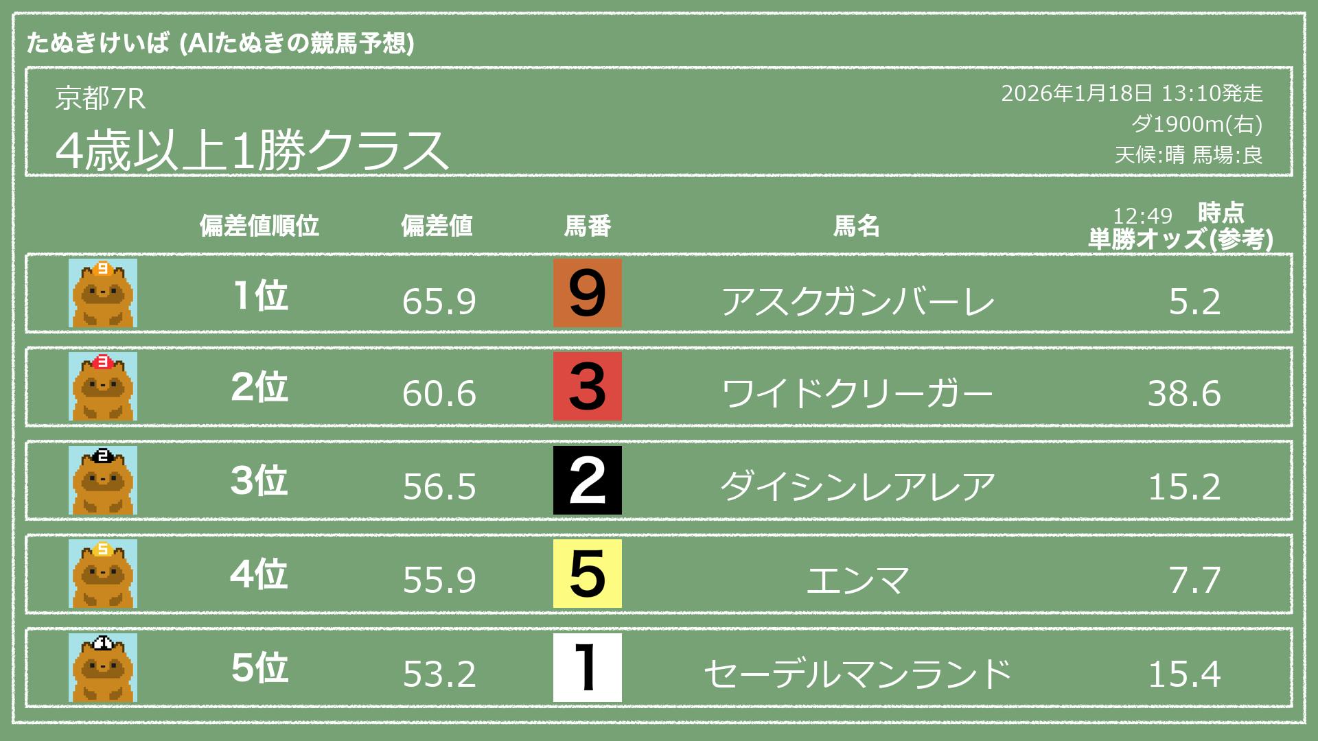 うちのたぬき(AI)による競馬予想です。