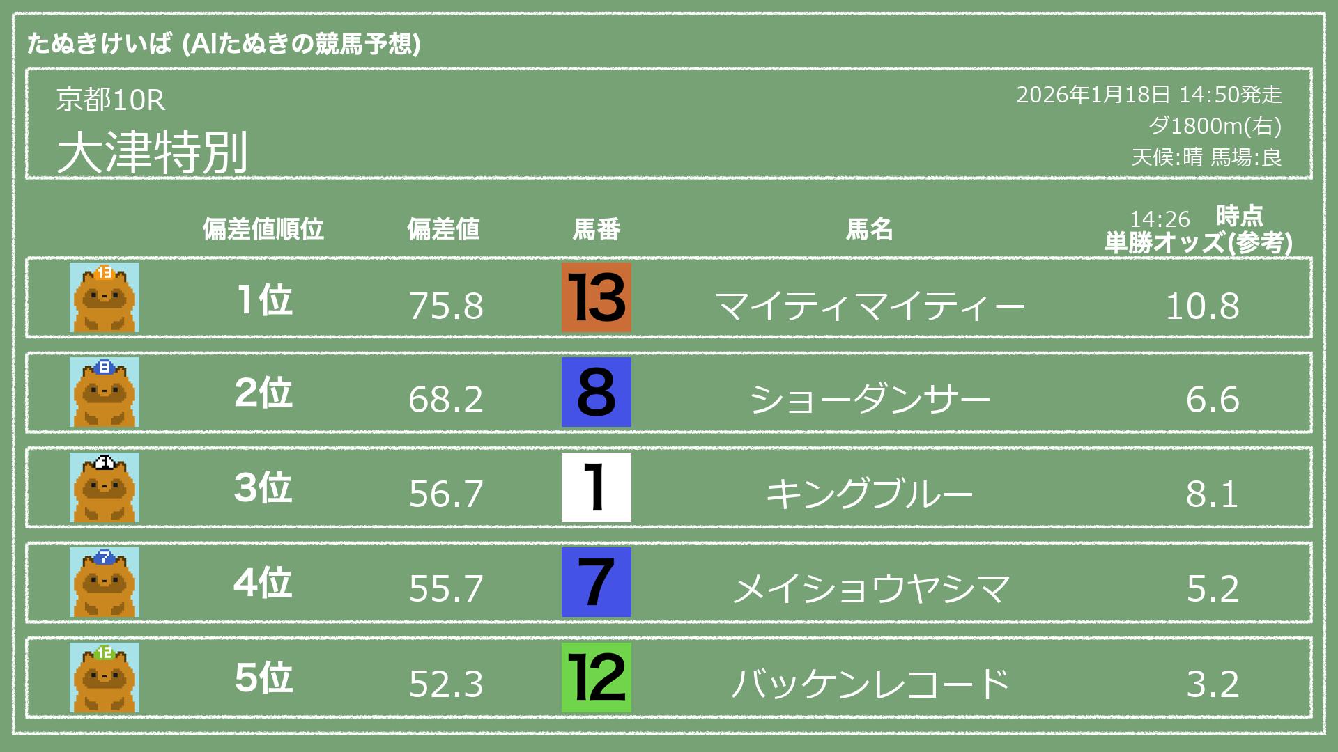 うちのたぬき(AI)による競馬予想です。