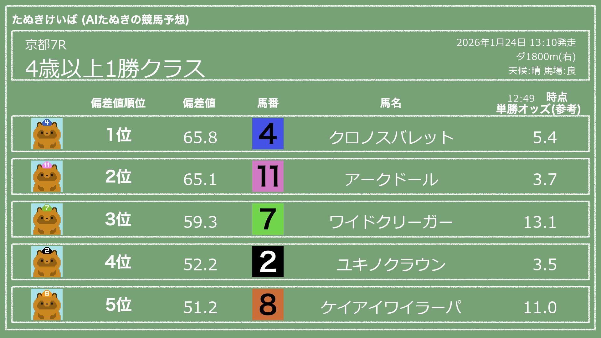 うちのたぬき(AI)による競馬予想です。レースごとに各馬の能力を偏差値で表現してみました。