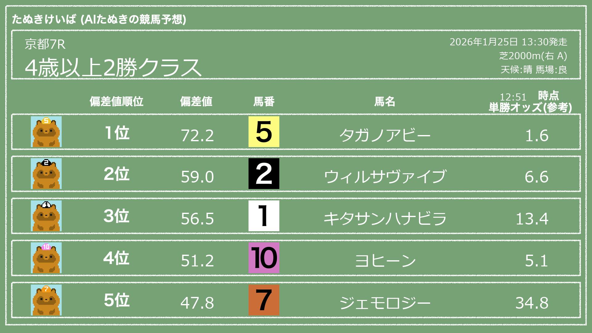 うちのたぬき(AI)による競馬予想です。レースごとに各馬の能力を偏差値で表現してみました。