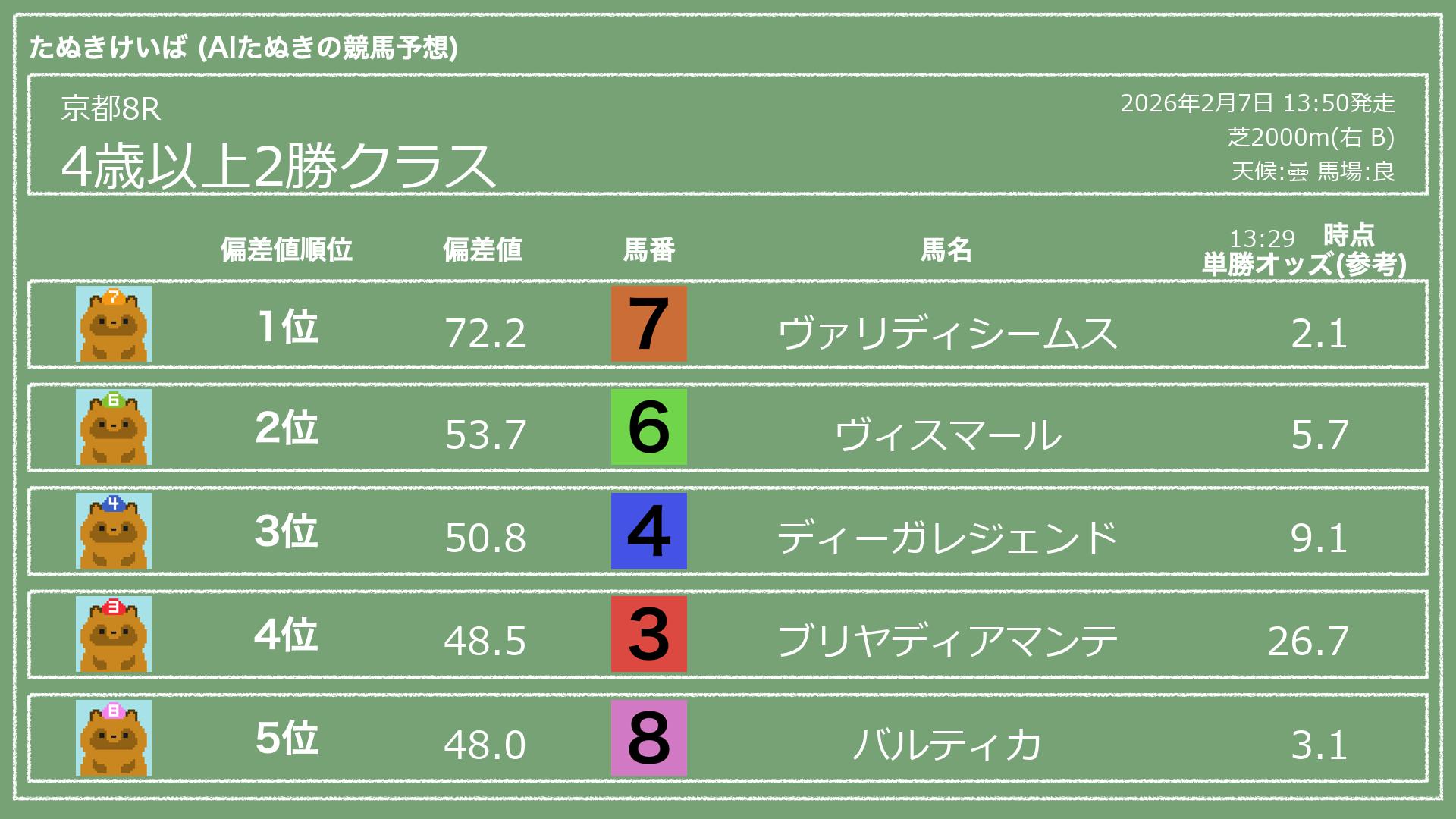 うちのたぬき(AI)による競馬予想です。レースごとに各馬の能力を偏差値で表現してみました。