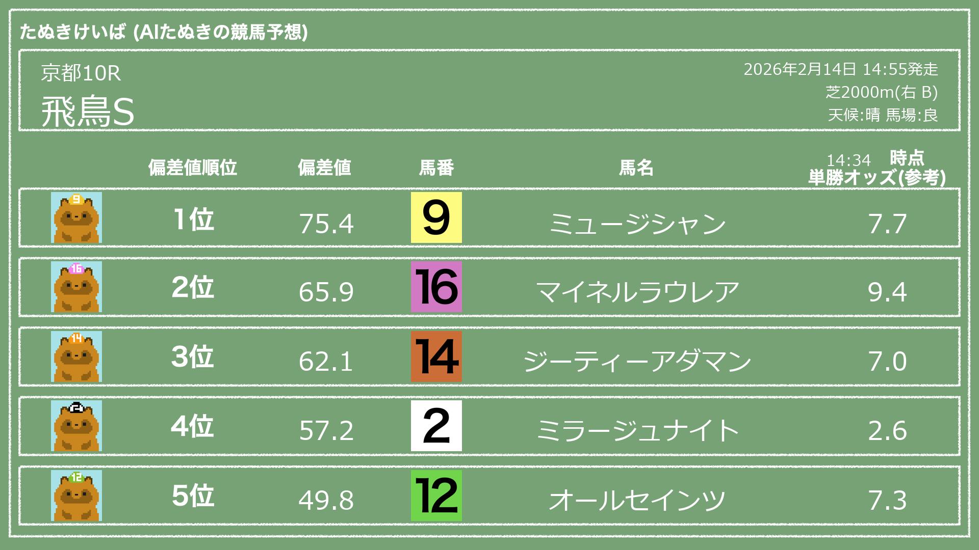 うちのたぬき(AI)による競馬予想です。レースごとに各馬の能力を偏差値で表現してみました。