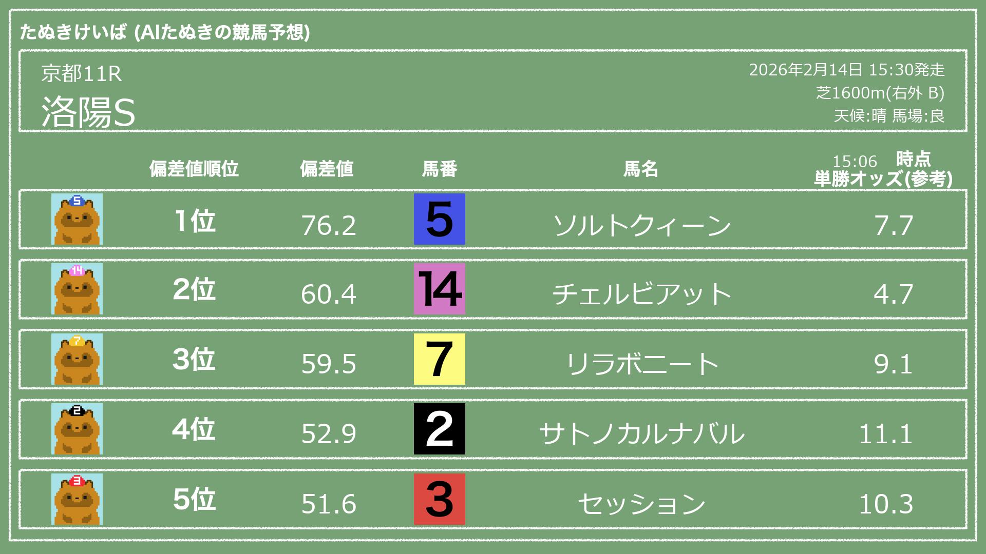 うちのたぬき(AI)による競馬予想です。レースごとに各馬の能力を偏差値で表現してみました。