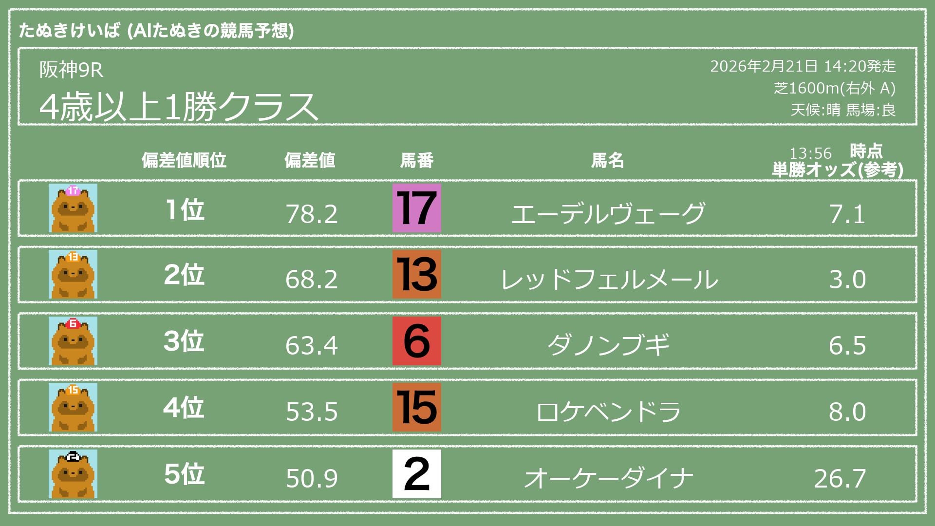 うちのたぬき(AI)による競馬予想です。レースごとに各馬の能力を偏差値で表現してみました。