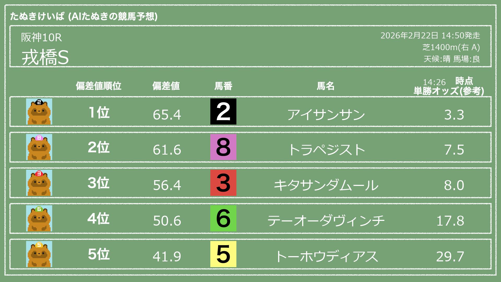 うちのたぬき(AI)による競馬予想です。レースごとに各馬の能力を偏差値で表現してみました。