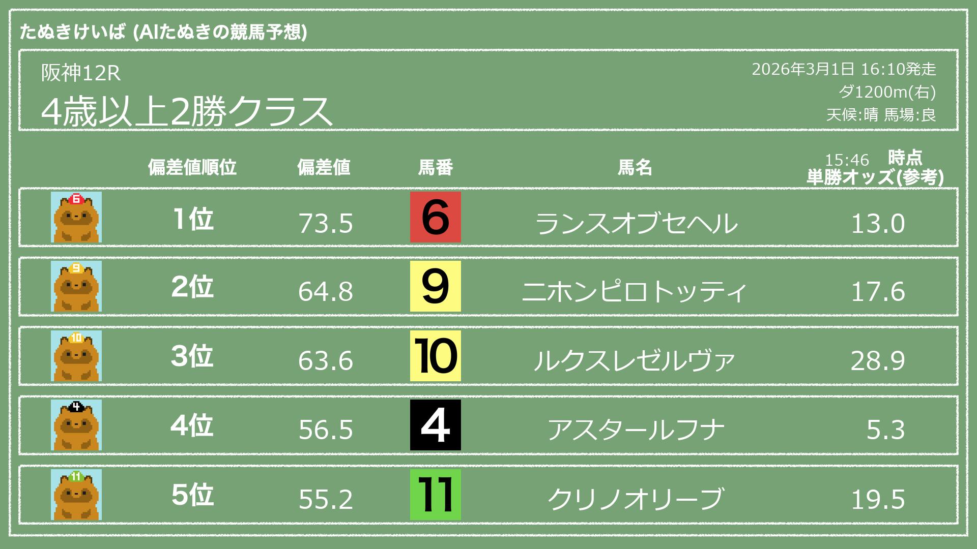 うちのたぬき(AI)による競馬予想です。レースごとに各馬の能力を偏差値で表現してみました。